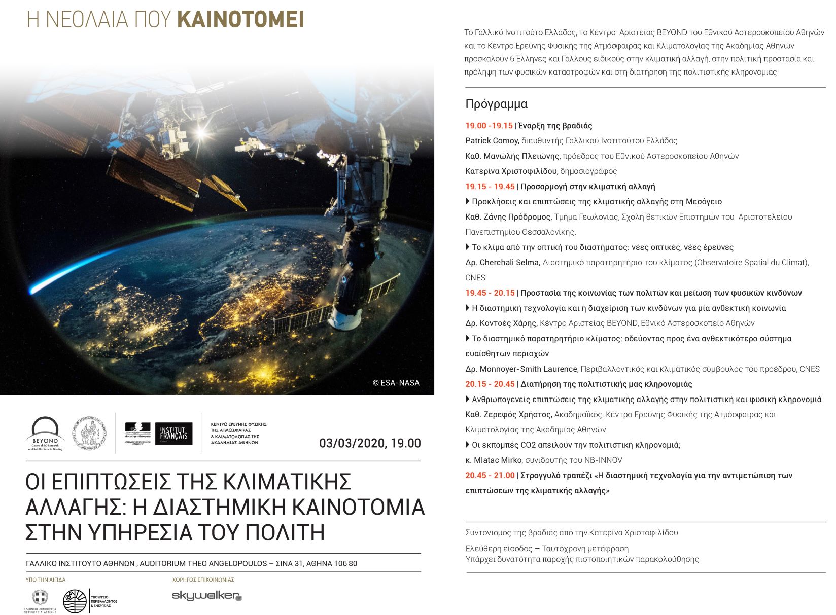 | 2020-03-03_Πρόσκληση_Γαλλικό Ινστιτούτο Ελλάδας, Εθνικό Αστεροσκοπείο Αθηνών, Ακαδημία Αθηνών Οι επιπτώσεις της κλιματικής αλλαγής: Η διαστημική καινοτομία στην υπηρεσία του πολίτη (στο Γαλλικό Ινστιτούτο Αθηνών, Σίνα 31, 10680 Αθήνα, από τις 7 μ.μ. (19.00) | 309.03 KB | 23-02-2020 |